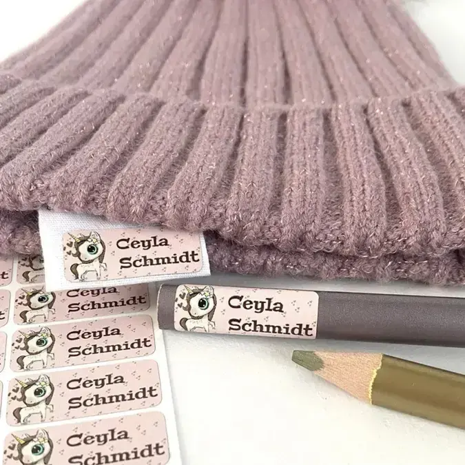 Möchten Sie ein Kleidungsstück markieren, dann kleben Sie die Schul-Namensaufkleber immer auf das Etikett im Nacken oder die seitlich im Kleidungsstück eingenähte Waschanleitung. Hier kann der Aufkleber am längsten halten und ist für Ihr Kind beim Tragen nicht bemerkbar. Kleben Sie den Namensaufkleber nicht auf den Textilstoff der Kleidung, da dieser sich zu viel bewegt, nachgibt und das Etikett sich dadurch schneller wieder lösen kann.